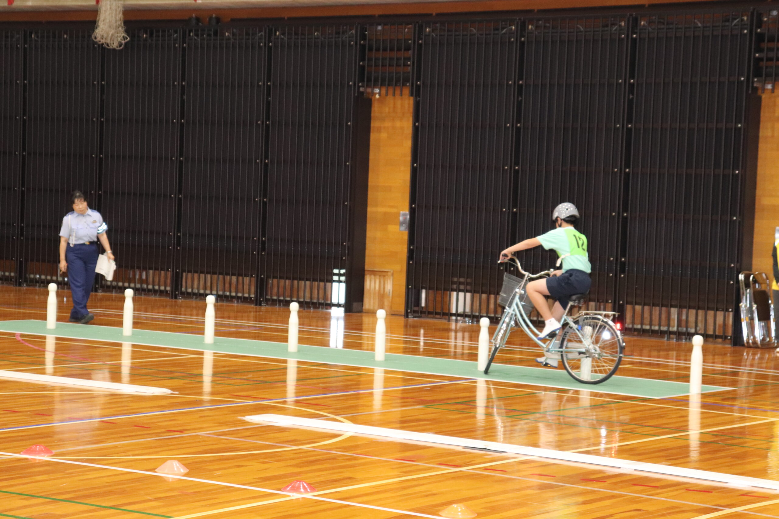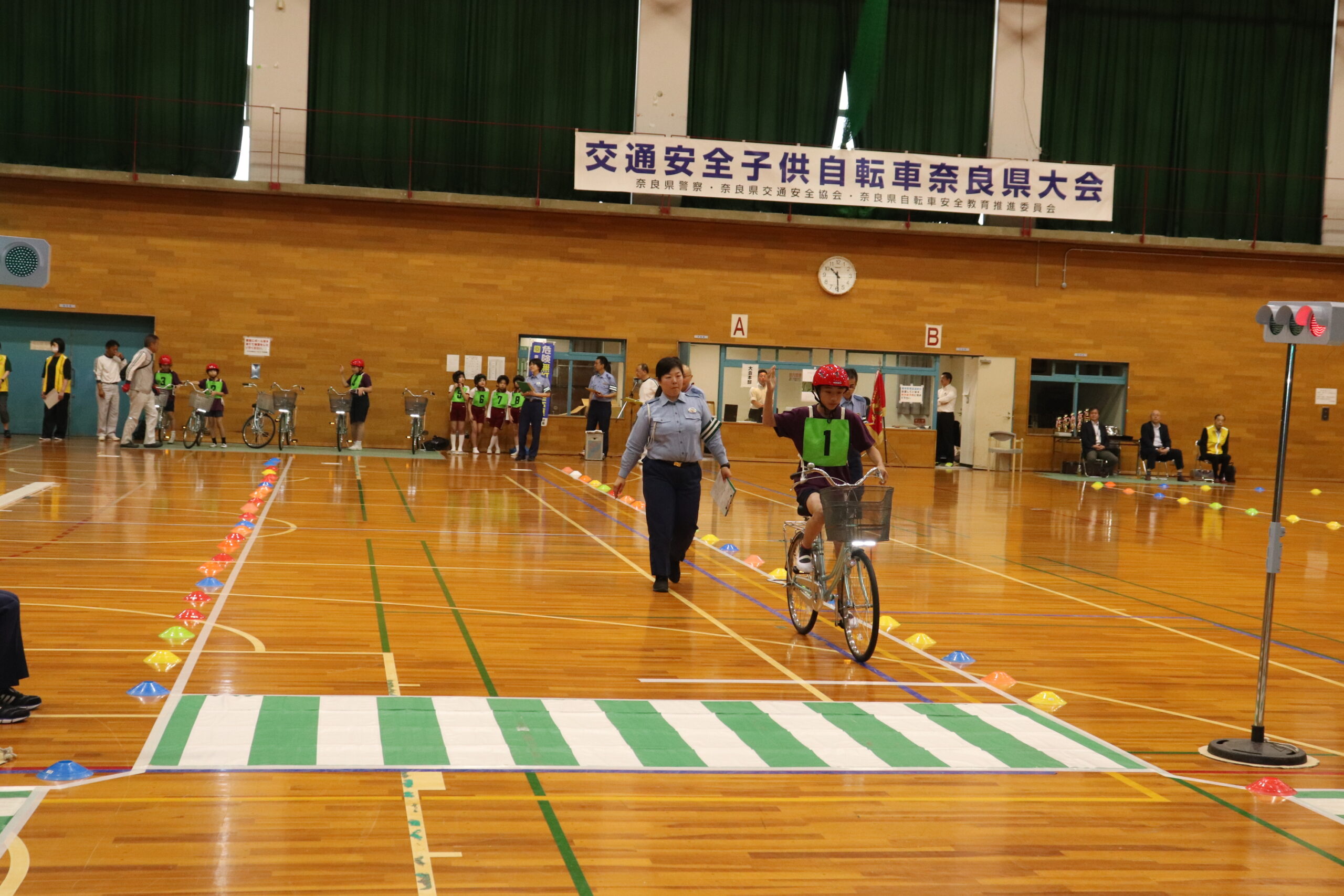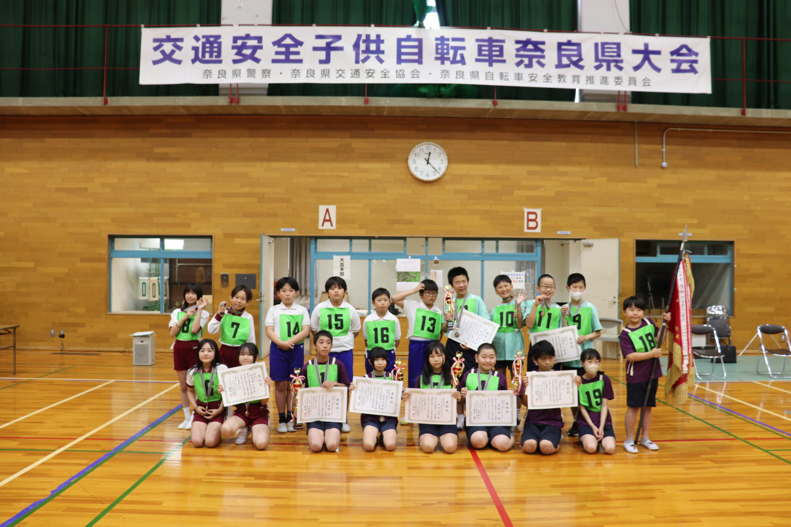 奈良県交通安全協会、奈良県自転車安全教育推進委員会及び奈良県警察は、本年5月31日(土)、すこやか斑鳩・スポーツセンター中央体育館において、「第47回交通安全こども自転車大会」を開催しました。大会には団体戦に4校4チーム(河合町立河合第二小学校、橿原市立畝傍南小学校、広陵町立広陵北小学校、香芝市立下田小学校)、個人戦に1校3名(いずれも河合町立河合第二小学校)が参加、学科テストと実技テストで知識と技能を競い合い、団体戦は河合第二小学校が優勝、個人戦でも河合第二小学校6年森結揮くんが大会初となる実技満点で優勝しました。優勝した河合第二小学校のメンバーは「去年は1点差で負けて本当に悔しかった。今年はリベンジできてとても嬉しい。全国大会でも落ち着いてがんばります」等と満面の笑みを浮かべていました。