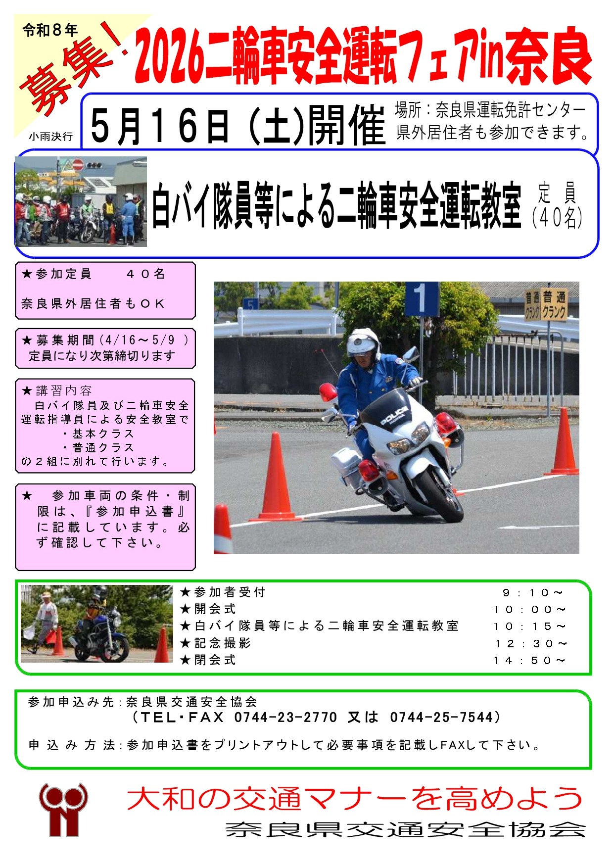5月16日(土)、奈良県運転免許センターにおいて、奈良県警察交通機動隊白バイ隊員及び二輪車安全運転指導員による二輪車安全運転教室の「2026二輪車安全運転フェアin奈良」を開催いたします(参加費無料、小雨決行)。